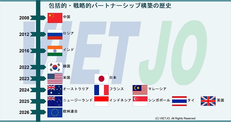 2012年に締結され、2016年に発効した包括的パートナーシップ協力協定(PCA)に加え、2019年に締結されたベトナムEU自由貿易協定(EVFTA)およびベトナムEU投資保護協定(EVIPA)が、双方の協力関係を法的に支えている。