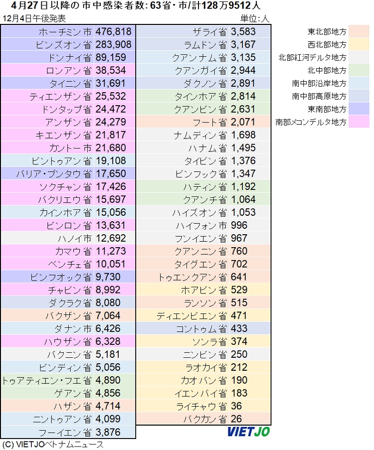 新規の市中感染者の内訳は、◇ホーチミン市:1636人、◇南部メコンデルタ地方カントー市:998人、◇東南部地方タイニン省:787人、◇南部メコンデルタ地方ベンチェ省:762人、◇南中部沿岸地方ビントゥアン省:626人、◇南部メコンデルタ地方ドンタップ省:624人、◇東南部地方バリア・ブンタウ省:620人、◇南部メコンデルタ地方カマウ省:568人、◇南部メコンデルタ地方バクリエウ省:565人、◇東南部地方ビンフオック省:562人、◇南部メコンデルタ地方ビンロン省:552人、◇南部メコンデルタ地方キエンザン省:498人、◇南中部沿岸地方カインホア省:467人、◇ハノイ市:455人、◇東南部地方ドンナイ省:433人、◇北中部地方トゥアティエン・フエ省:335人、◇南部メコンデルタ地方アンザン省:319人、◇東南部地方ビンズオン省:319人、◇南部メコンデルタ地方チャビン省:301人、◇南部メコンデルタ地方ハウザン省:288人、◇南部メコンデルタ地方ティエンザン省:209人、◇南中部沿岸地方ビンディン省:203人、◇南中部高原地方ザライ省:180人、◇東北部地方ハザン省:140人、◇北部紅河デルタ地方バクニン省:119人、◇南中部高原地方ダクノン省:116人、◇南中部沿岸地方ダナン市:104人、◇北中部地方タインホア省:103人、◇南部メコンデルタ地方ロンアン省:91人、◇東北部地方タイグエン省:82人、◇北部紅河デルタ地方ハイフォン市:81人、◇南中部沿岸地方ニントゥアン省:76人、◇北部紅河デルタ地方フンイエン省:65人、◇北中部地方ゲアン省:61人、◇南中部沿岸地方クアンナム省:59人、◇北部紅河デルタ地方ハイズオン省:55人、◇南中部沿岸地方フーイエン省:52人、◇東北部地方フート省:49人、◇北部紅河デルタ地方ビンフック省:44人、◇南中部高原地方ダクラク省:42人、◇南中部沿岸地方クアンガイ省:41人、◇西北部地方イエンバイ省:40人、◇北部紅河デルタ地方ナムディン省:39人、◇北中部地方クアンチ省:34人、◇北部紅河デルタ地方タイビン省:27人、◇北中部地方クアンビン省:25人、◇東北部地方トゥエンクアン省:25人、◇北中部地方ハティン省:21人、◇西北部地方ホアビン省:20人、◇東北部地方クアンニン省:20人、◇東北部地方バクザン省:20人、◇西北部地方ラオカイ省:11人、◇北部紅河デルタ地方ハナム省:8人、◇西北部地方カオバン省:8人、◇北部紅河デルタ地方ニンビン省:6人、◇西北部地方ソンラ省:1人、◇東北部地方バクカン省:1人。