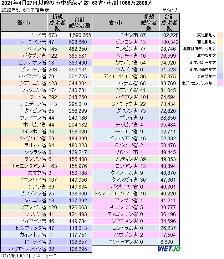6日午後の発表時点でベトナム国内の累計感染者数は1067万0570人となっている。