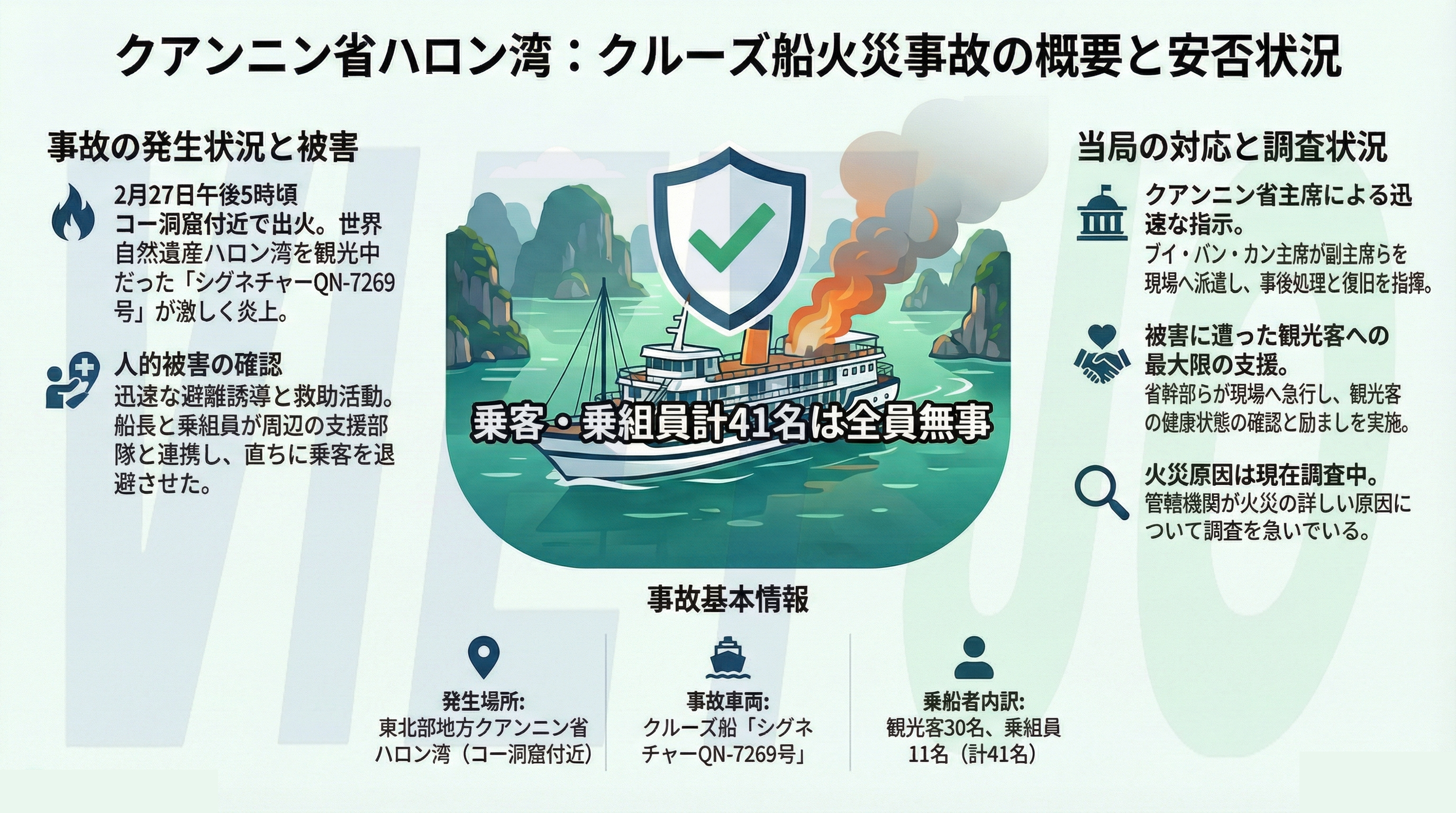 同省人民委員会によると、同日午後5時頃、ハロン湾のコー洞窟付近を観光中だった同船から出火した。同船には当時、観光客30人と乗組員11人の計41人が乗船していた。