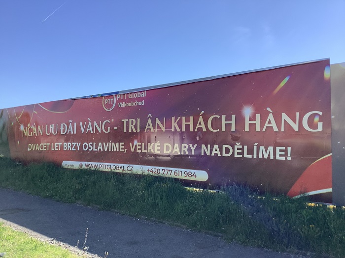 「Sídliště Písnice」という停留所のそばに、大きなベトナム語の看板が立つ