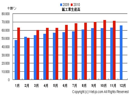 それによると、物価上昇要因を除外した11月単月の鉱工業生産高は前年同月比14.3%増の71兆3430億(約2842億4000万円)となった。また年初11か月の鉱工業生産高は前年同期比13.8%増の717兆1000億ドン(約2兆8100億円)となった。