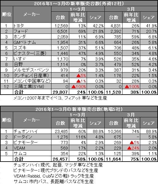 ベトナム自動車工業会(VAMA)の発表によると、2016年年初3か月の新車販売台数は、外資12社が前年同期比+24%増の2万9807台、地場5社が同+58%増の2万6457台だった。