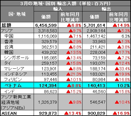 日本の財務省が発表した2016年3月の貿易統計(速報)によると、ベトナムの対日貿易収支は160億1900万円の黒字だった。