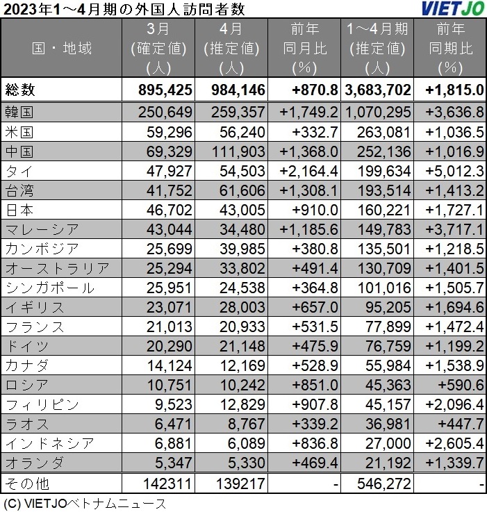 統計総局(GSO)の発表によると、4月の外国人訪問者数(推定値)は前月比+9.9%増の98万4146人で、前年同月の9.7倍となった。
