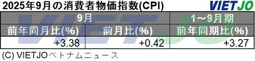 財政省傘下統計局(NSO)の発表によると、2025年9月の全国消費者物価指数(CPI)は前月比+0.42%、前年同月比では+3.38%上昇した。