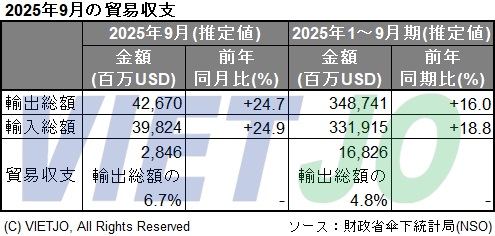 財政省傘下統計局(NSO)が発表した統計データによると、2025年9月の輸出額(推定値)は前年同月比+24.7%増の426億7000万USD(約6兆4000億円)、輸入額は同+24.9%増の398億2400万USD(約5兆9700億円)だった。これにより、同月の貿易収支は28億4600万USD(約4300億円)の黒字となった。