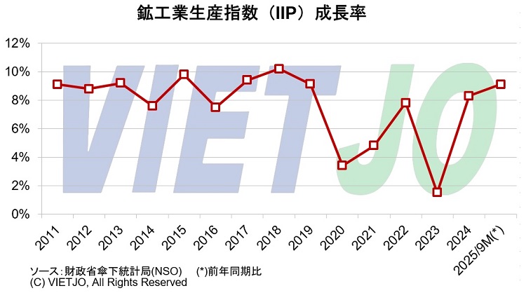 製造・加工業と電気生産の拡大を背景に、1~9月期のIIPは全国34省・市すべてで前年同期を上回った。中でも、◇東北部地方クアンニン省が前年同期比+34.3%増、◇北部地方フート省が同+29.4%増、◇北部紅河デルタ地方ニンビン省が同+23.0%増などが高い伸びを示した。