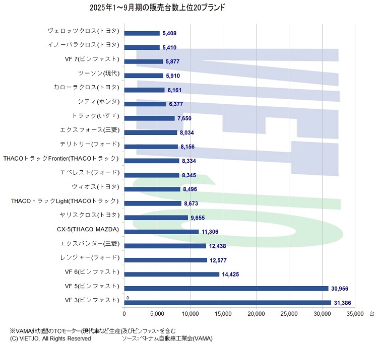 ベトナム自動車工業会(VAMA)の発表によると、2025年9月におけるVAMA加盟企業とVAMA非加盟企業を合わせた新車販売台数(TCモーターおよびビンファスト=VinFast含まず)は前月比+18%増、前年同月比では▲16%減の3万0688台だった。このうち、国産車が前月比+14%増、輸入車が同+22%増となった。