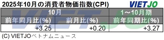 財政省傘下統計局(NSO)の発表によると、2025年10月の全国消費者物価指数(CPI)は前月比+0.20%上昇、前年同月比では+3.25%上昇した。