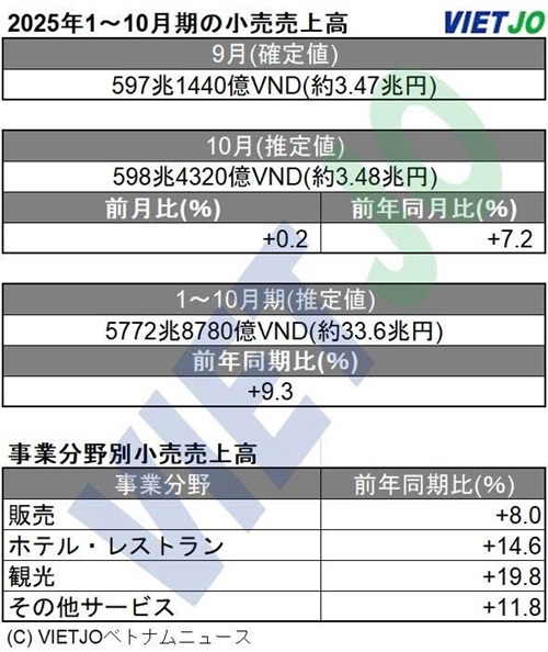 財政省傘下統計局(NSO)の発表によると、2025年10月の小売売上高(推定値)は前月比で+0.2%増、前年同月比では+7.2%増の598兆4320億VND(約3兆5000億円)だった。