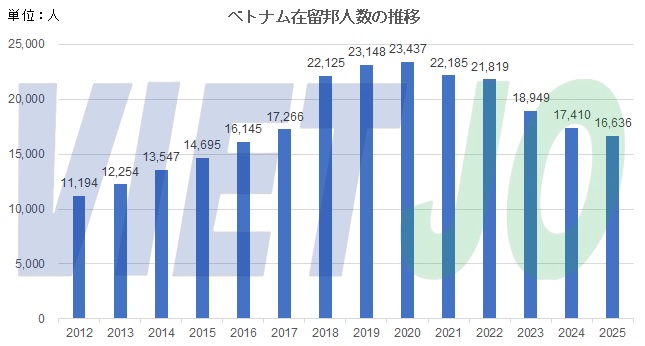 日本の外務省が発表した海外在留邦人数調査統計の最新版によると、2025年10月1日時点におけるベトナム在留邦人数は前年比▲4.4%減の1万6636人で、国・地域別で15位となった。2025年のベトナム在留邦人数は、直近9年間で最も少なかった。