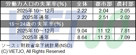 財政省傘下統計局(NSO)によると、2025年における労働力人口の失業率は前年比▲0.02%pt低下の2.22%だった。このうち、都市部の失業率が2.51%、農村部が2.02%となっている。