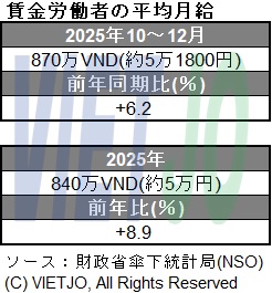 収入について、2025年の賃金労働者の平均月給は前年比+8.9%増の840万VND(約5万円)で、男性労働者の平均月給は950万VND(約5万6500円)、女性労働者は720万VND(約4万3000円)だった。地域別でみると、都市部が1010万VND(約6万円)、農村部が730万VND(約4万3500円)となっている。