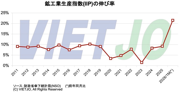 財政省傘下統計局(NSO)の発表によると、2026年1月の鉱工業生産指数(IIP)の伸び率は前月比で▲0.2%減、前年同月比では+21.5%増加した。  1月のIIPは、受注環境の改善に加え、前年同月にテト(旧正月)休暇が...