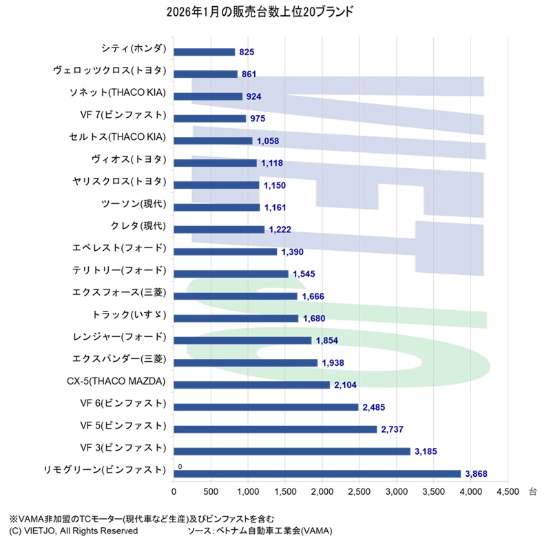 2026年1月の自動車市場は、前年同月比では大幅増となったが、前月比では減少し、実勢としては弱含んだ。年末商戦の反動減や消費者の慎重姿勢が影響したとみられる一方、不動産開発を中核とする民間複合企業ビングループ[VIC](Vingroup)傘下の電気自動車(EV)メーカーであるビンファスト(Vinfast)は販売を伸ばし、存在感を高めた。