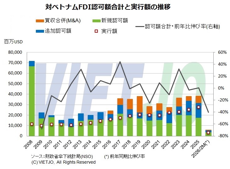 財政省傘下海外投資局(FIA)が発表した海外直接投資(FDI)に関するデータによると、2026年1~2月期のFDI認可額(推定値)は前年同期比▲12.6%減の60億3000万USD(約9600億円)となった。一方、同期の実行額(推定値)は同+8.8%増の32億1000万USD(約5100億円)に達し、同期間としては直近5年間で最高水準となった。