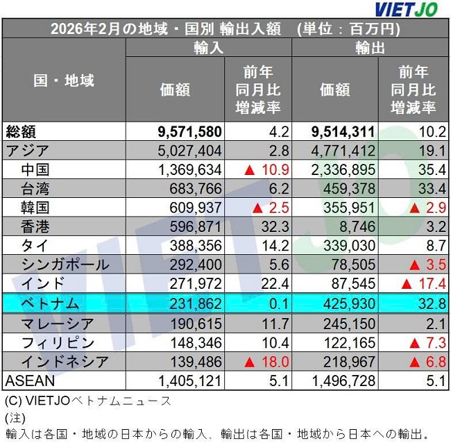 日本の財務省が発表した2026年2月の貿易統計(速報)によると、ベトナムの対日貿易収支は前年同月比+117.7%増の1940億6800万円の黒字となった。