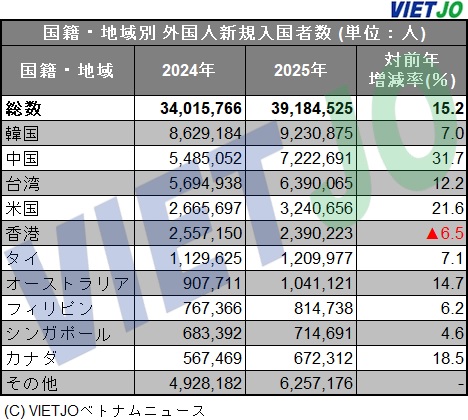 日本の法務省出入国在留管理庁が発表した2025年における外国人入国者数及び日本人出国者数等に関する統計によると、同年の日本におけるベトナム人新規入国者数は前年比▲1.9%減の32万8940人だった。全体の外国人新規入国者数が前年比+15.2%増の3918万4525人と増加する中、ベトナム人入国者数は微減となった。