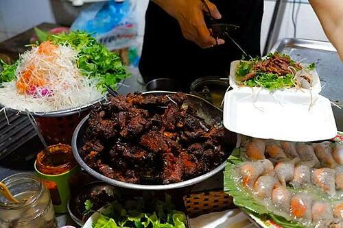 若者に人気のビーフジャーキーサラダの店。この店のビーフジャーキーはトウガラシ、レモングラス、生姜、うま味調味料、砂糖に浸けた牛肉を干したものが使われている。でき上がったビーフジャーキーは細かく裂かれ、千切りの青いパパイヤやにんじん、炒りピーナッツ、甘酢と和えられる。甘酢が千切り野菜に染み込み、ピリ辛のビーフジャーキーに合い、カリッと香ばしいピーナッツも良いアクセントになる。1皿3万VND(約144円)。