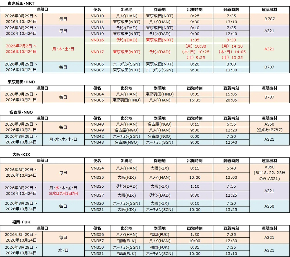 夏季運航スケジュールでは、近年高まる南中部地方ダナン市への旅行需要に対応するため、7月1日よりダナン~大阪線を週5便に増便する。同路線は、従来の週4便(月・木・金・日)に加え、新たに水曜日の運航を追加する。