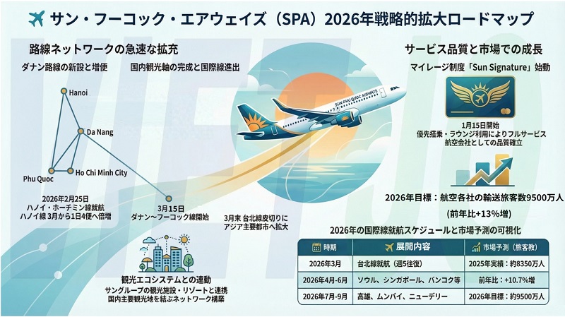 SPAは、ベトナムのフルサービス航空会社として、2025年11月に商業運航を開始して以来、急速に運航規模を拡大している。これまでにフーコック発着の国内線を拡充してきたほか、2026年3月末からは台北(台湾)線の就航も控えており、国内外の航空市場でのネットワーク拡充と競争力強化を進めている。