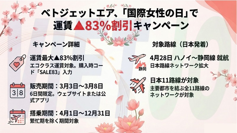 格安航空会社(LCC)最大手ベトジェットエア[VJC](Vietjet Air)は、3月8日の「国際女性の日」に合わせて、3月3日(火)から8日(日)までの6日間限定で、すべての国内線と国際線の航空券を対象にエコクラス運賃が最大83%割引(税など含まず)となるキャンペーンを実施する。